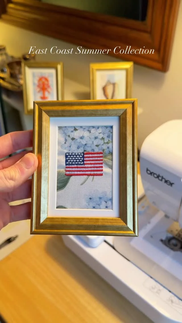 A collection inspired by summers along the East Coast. Salt air, striped umbrellas, garden blooms, and timeless American motifs. Each piece is carefully embroidered and set in a classic gold wooden frame, designed to feel both nostalgic and refined.