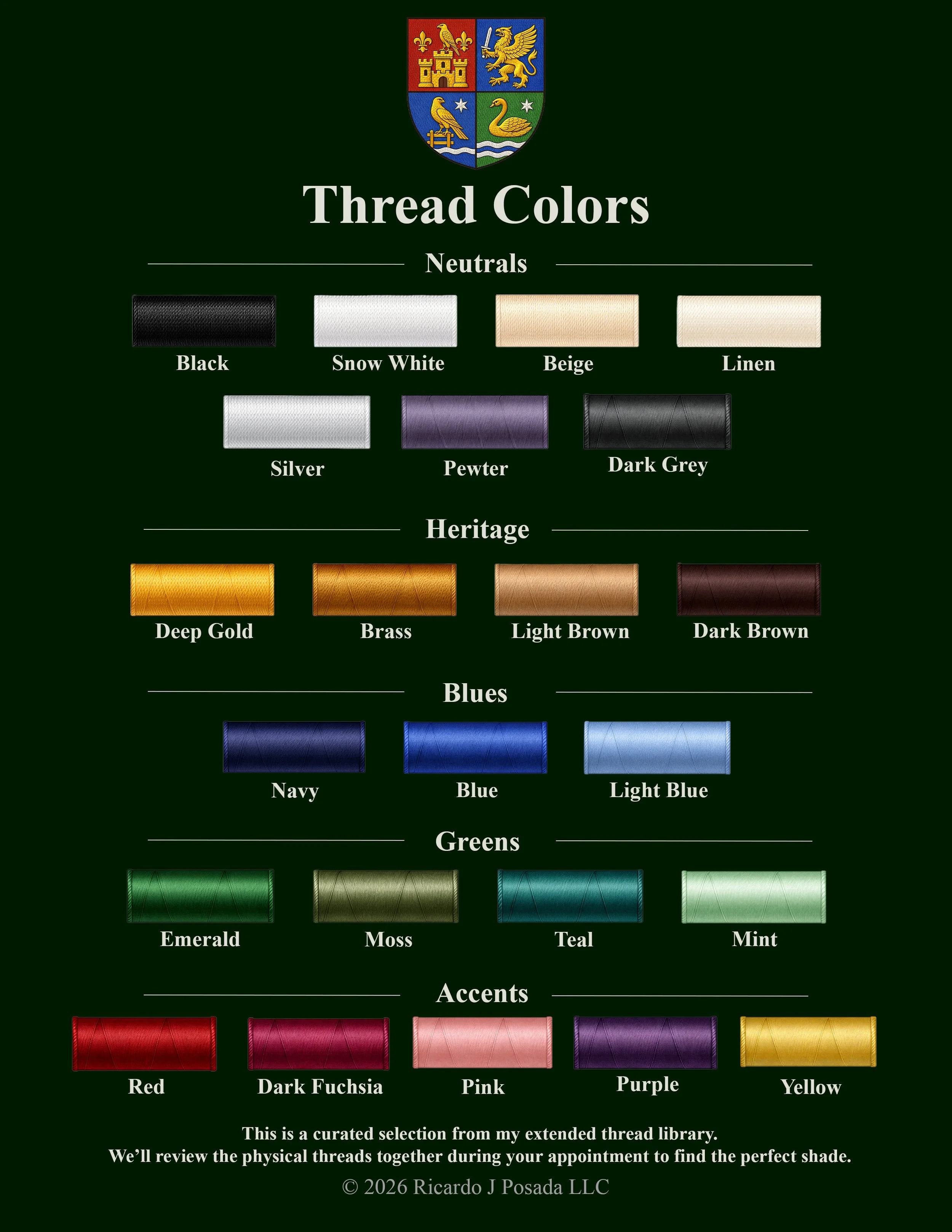 Thread colors are listed in the “Initials & Lettering” menu and finalized after purchase via order notes or email confirmation.
